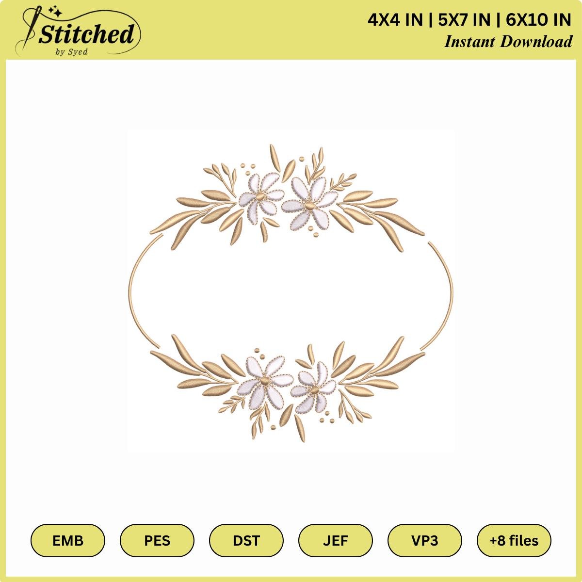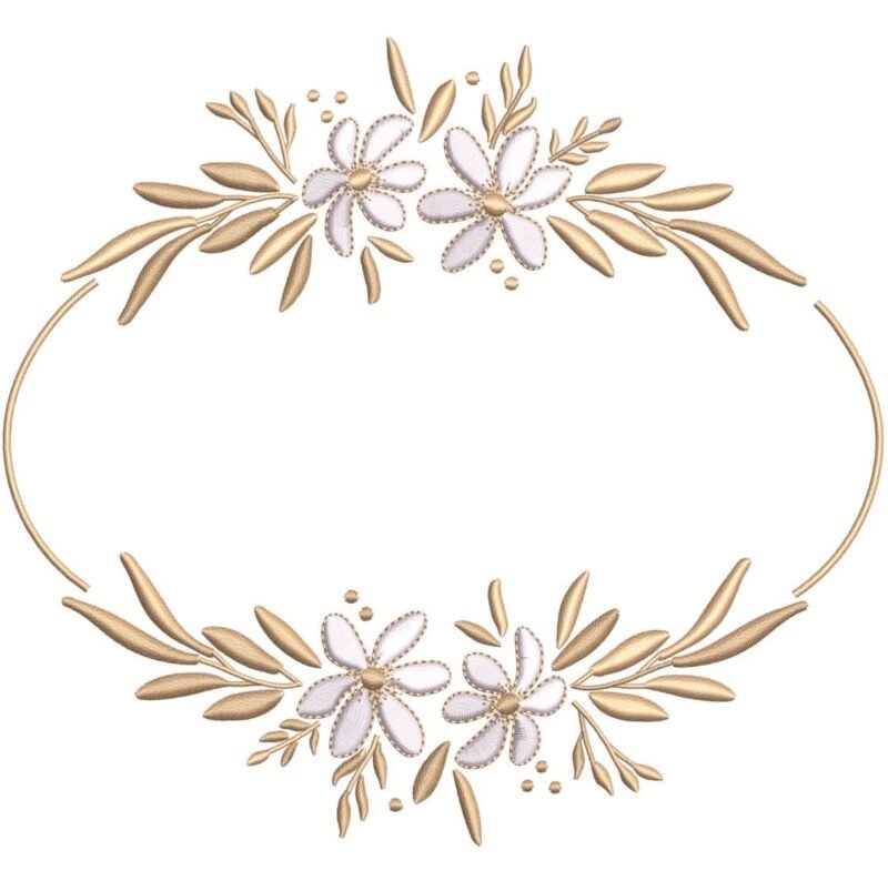 Elegant Floral Oval Embroidery Frame Design | Gold & White Flower Border Pattern | Wedding Monogram Machine Embroidery PES, DST, JEF