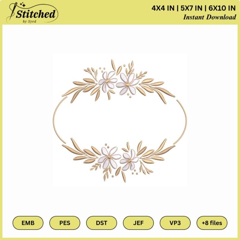 Schreibe die erste Rezension für „Elegant Floral Oval Embroidery Frame Design | Gold & White Flower Border Pattern | Wedding Monogram Machine Embroidery PES, DST, JEF“