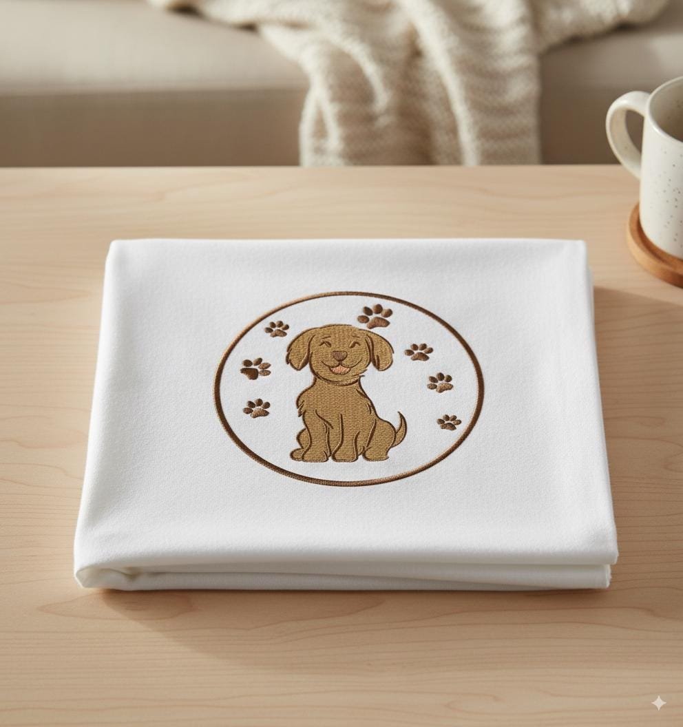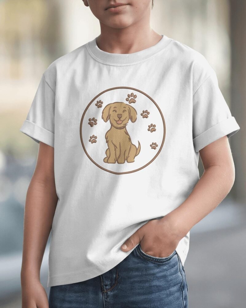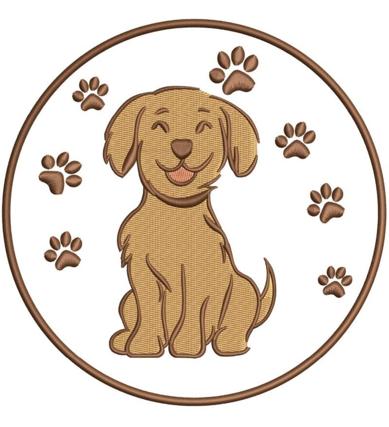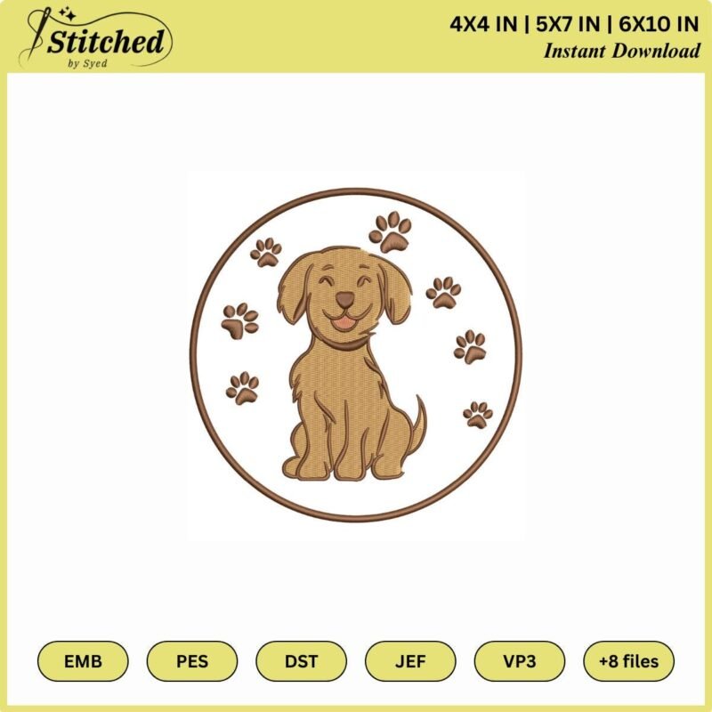 Bring joy to your projects with this adorable Happy Puppy Embroidery Design! Featuring a smiling puppy surrounded by playful paw prints inside a neat circle border, this design is perfect for kids’ clothes, baby items, pet accessories, tote bags, cushions, and home décor projects. Whether you’re creating a dog lover gift, a pet shirt design, or a cute animal print for nursery décor, this versatile embroidery pattern will make every project special.