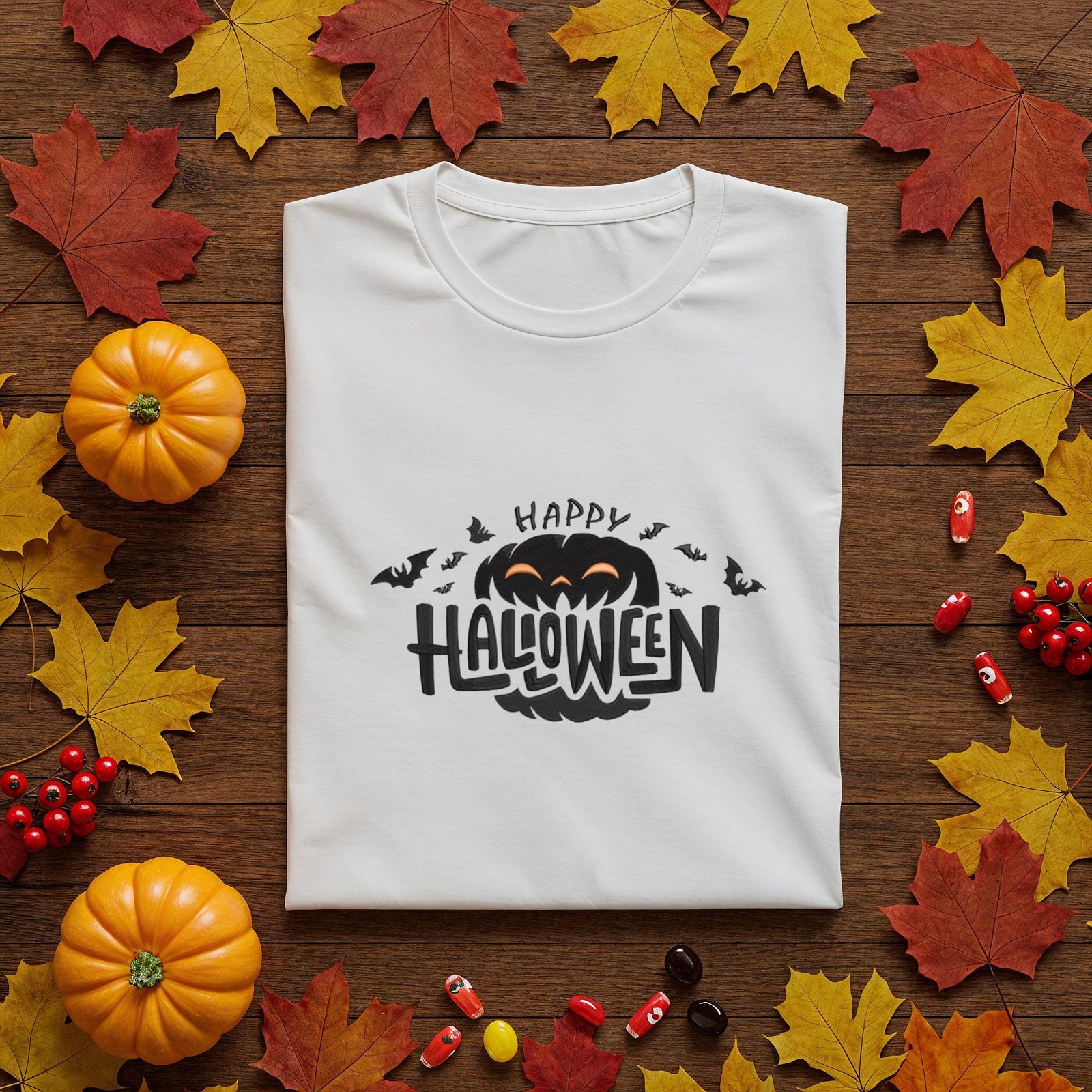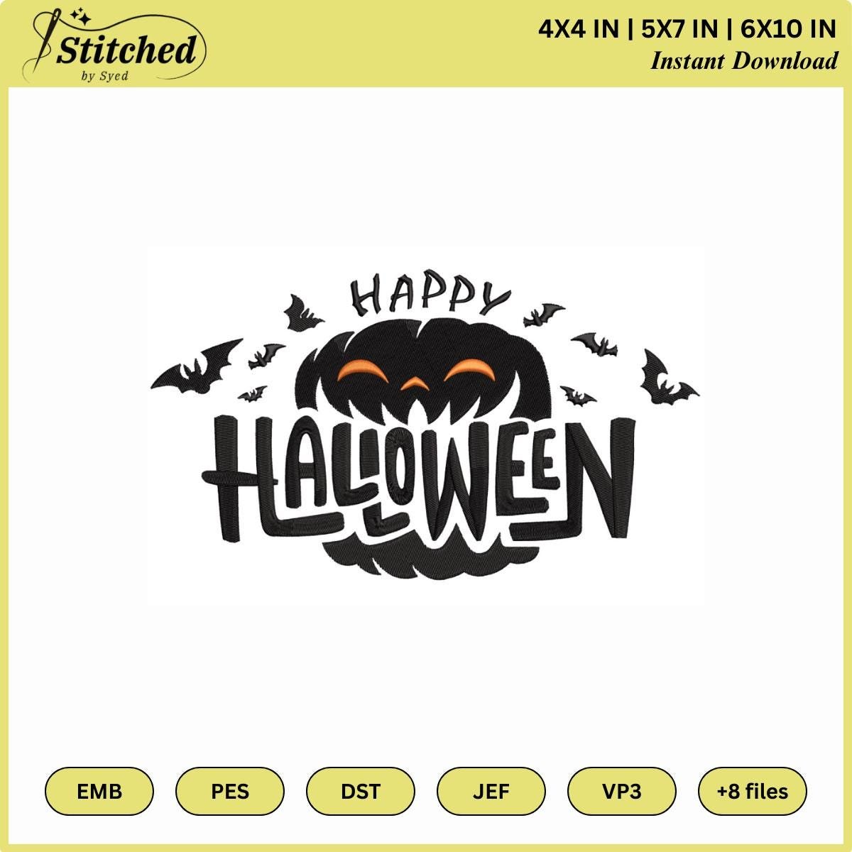 Celebrate spooky season with this Happy Halloween embroidery design — featuring a fun pumpkin, flying bats, and bold festive lettering. Perfect for embroidery on shirts, bags, home décor, and party projects!
