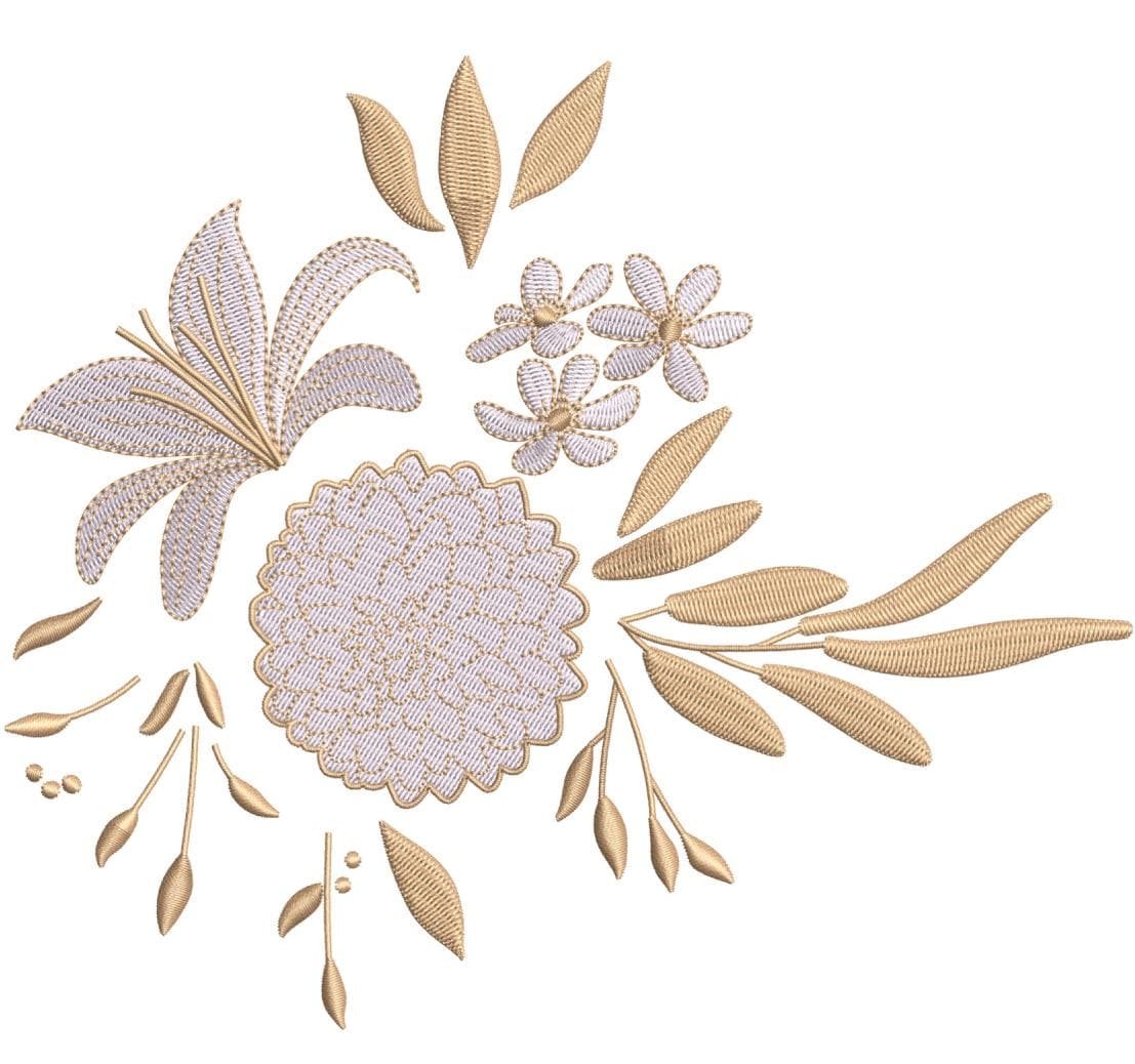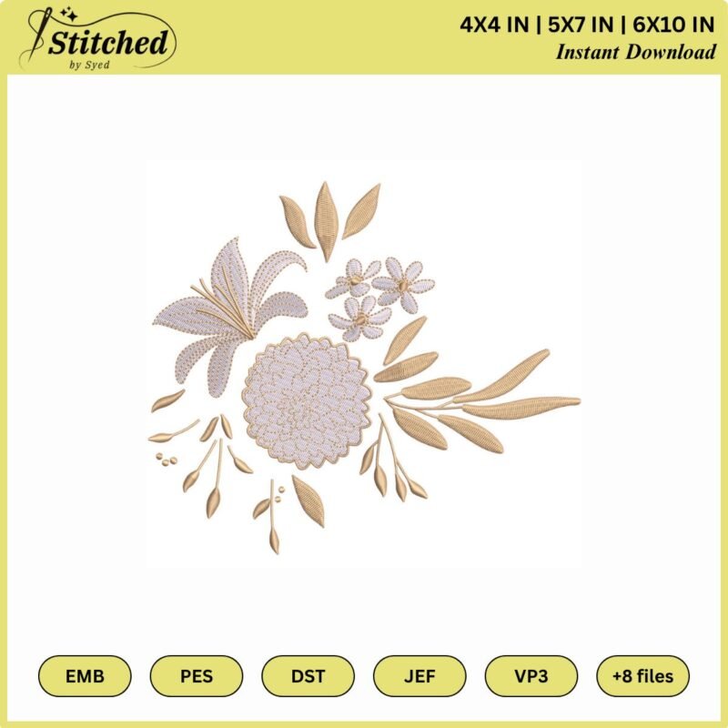 Transformez vos projets avec cet élégant motif de broderie floral or et blanc - un motif numérique de qualité supérieure conçu pour des résultats époustouflants sur des robes, des coussins et des décorations d'intérieur. Parfait pour ajouter un charme luxueux et moderne à vos créations de broderie.