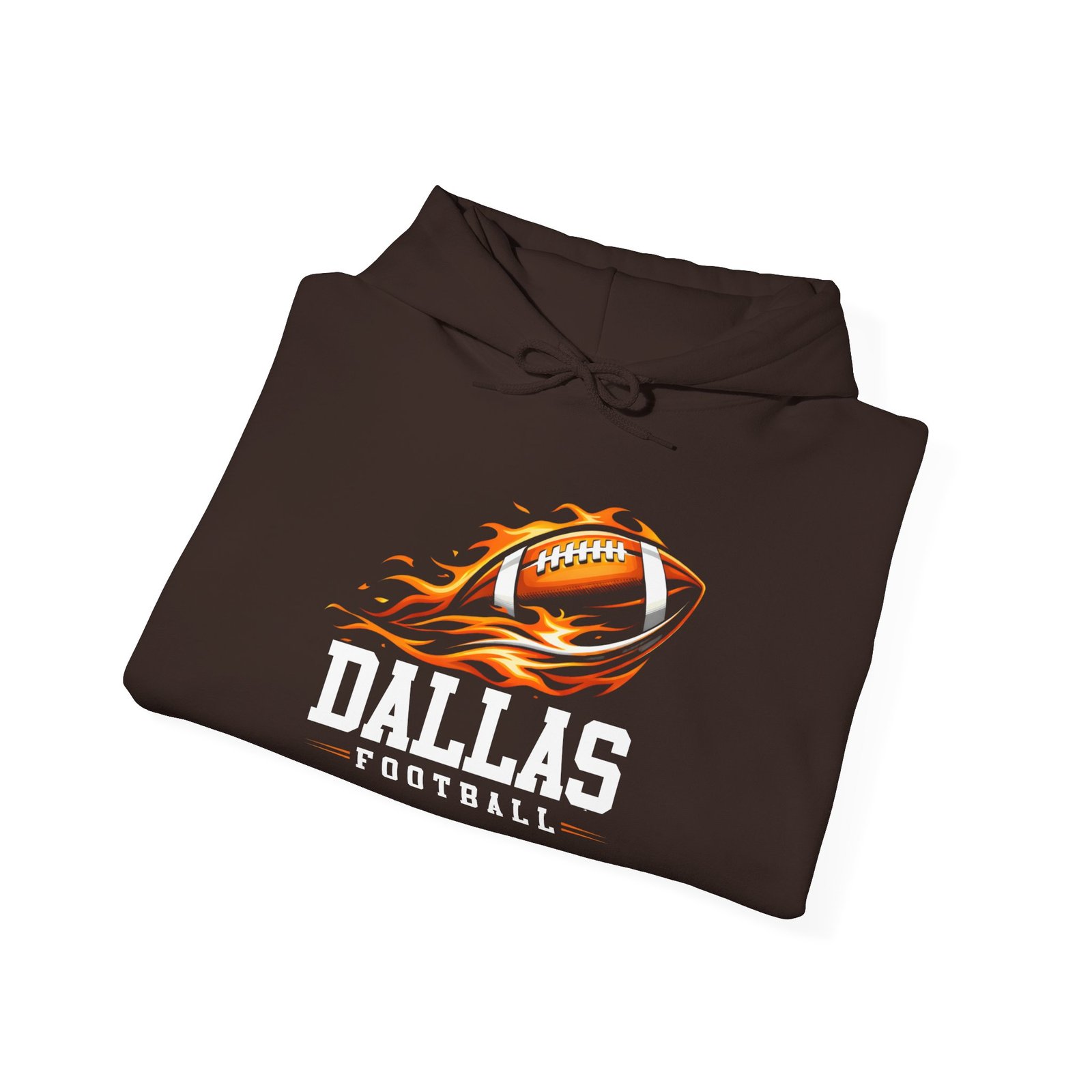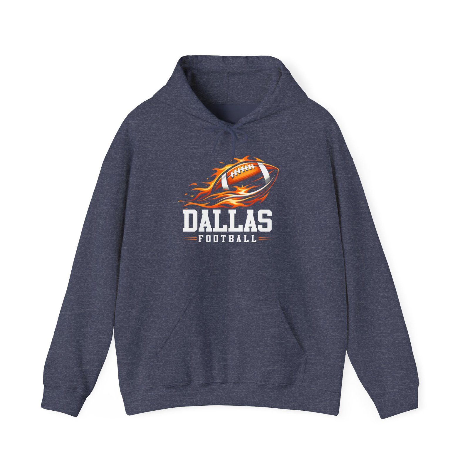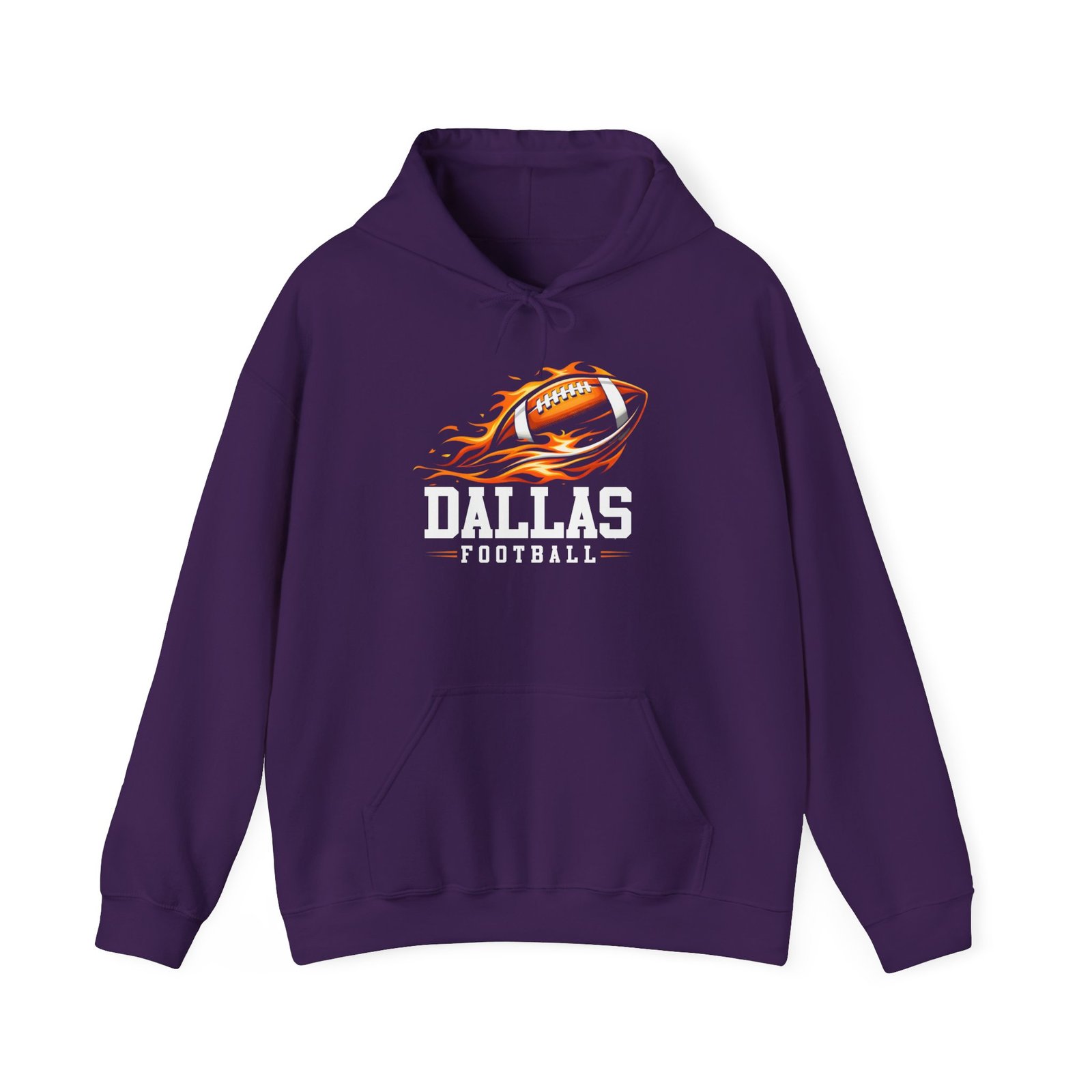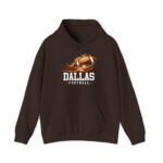 This hoodie channels game-day heat: a soft, medium-weight pullover with a bold flaming football graphic and strong collegiate lettering that reads “Dallas Football.” It sits comfortably over layers and feels broken-in from the first wear—warm, slightly brushed inside, and built to move with you whether you’re cheering from the stands, tailgating in a chilly parking lot, or watching the game at a friend’s house. The roomy kangaroo pocket keeps hands warm and holds small essentials. Subtle details like the double-lined hood and color-matched drawcord keep the look clean while durable DTF/DTG printing and optional chest or wrist embroidery make the design pop and last through washes.