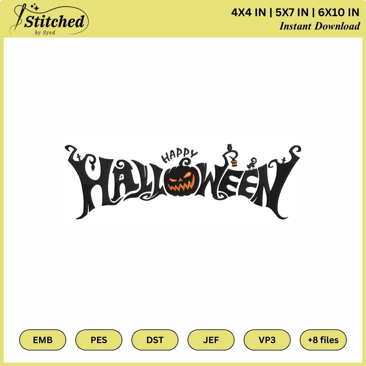 Happy Halloween Embroiderie Design, Fall Halloween Pumpkin Embroidery Pattern, 3 Sizes, Autumn Embroidery Designs Instant Download Gift Ideas