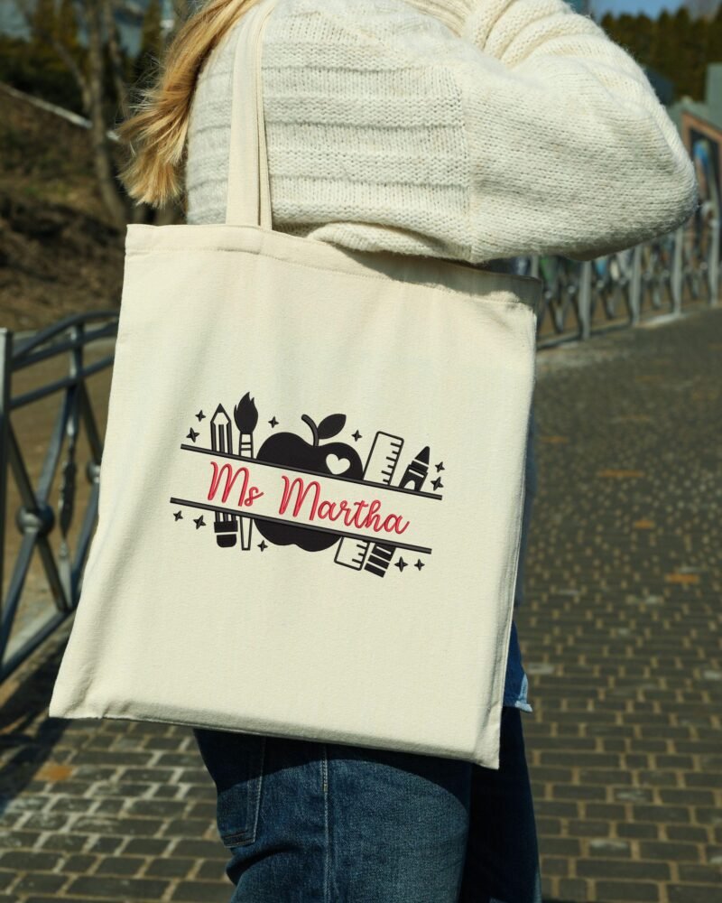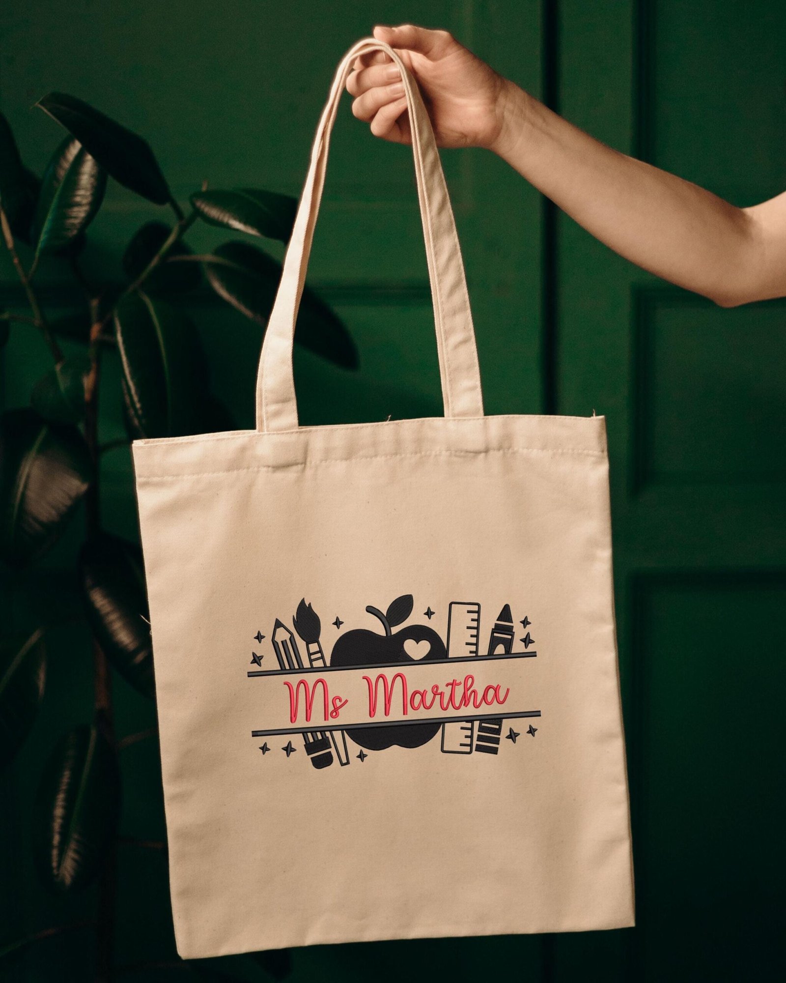 Featuring a stylish apple, pencil, ruler, and paintbrush frame, this design is perfect for teacher gifts, tote bags, shirts, classroom décor, or back-to-school projects.